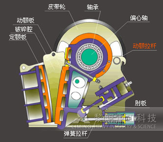 顎式破碎機破碎方式為曲動擠壓型,運作原理主要模擬動物的兩顎運動。工作時,電動機驅(qū)動皮帶和皮帶輪,通過偏心軸使動顎上下運動,當動顎上升時,肘板和動顎間夾角變大,從而推動動顎板向定顎板接近,物料通過兩顎板之間的擠壓、搓、碾等實現(xiàn)多重破碎;當動顎下行時,肘板和動顎間夾角變小,動顎板在拉桿、彈簧的作用下離開定顎板,已破碎物料在重力的作用下,經(jīng)顎腔下部的出料口自由卸出。隨著電動機的連續(xù)轉(zhuǎn)動,動顎做周期性的壓碎和排料,實現(xiàn)批量生產(chǎn)。