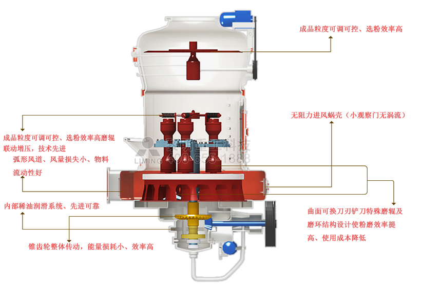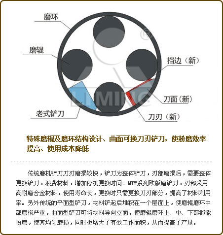 曲面可換刀刃鏟刀,特殊磨輥及磨環結構設計使粉磨效率提高、使用成本降低