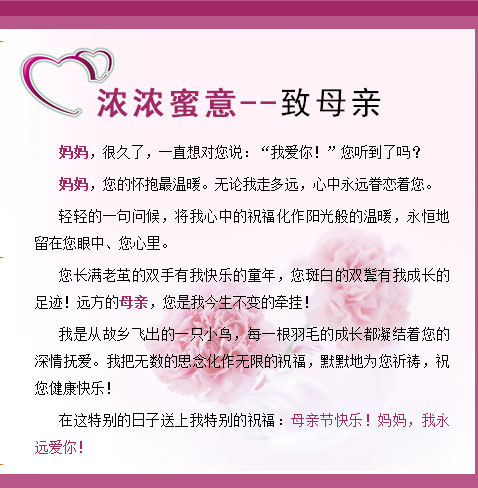 在這特別的日子送上我特別的祝福:母親節快樂!媽媽,我永遠愛你!