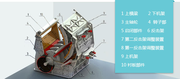 由機架部分、轉子部分、反擊架、翻蓋裝置和傳動部分組成。工作時,電機高速旋轉帶動轉子做高速運動。當物料由入料口進入機器時,受到轉子上的板錘高速撞擊而被破碎,然后被拋到反擊襯板上再次破碎,之后又從反擊襯板上彈回到板錘作用區重新破碎。在此過程中,物料之間也相互撞擊,達到破碎的效果。此過程重復進行,直到物料被破碎至所需粒度,由出料口排出。