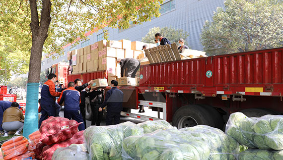 封控之下,臨港基地的生活物資和生產物資,都十分短缺。4 月初,黎明鄭州總部及時辦理好保供相關通行證,將新鮮時蔬、米面糧油等生活必需品分揀、裝箱、裝車,馳援浦東。